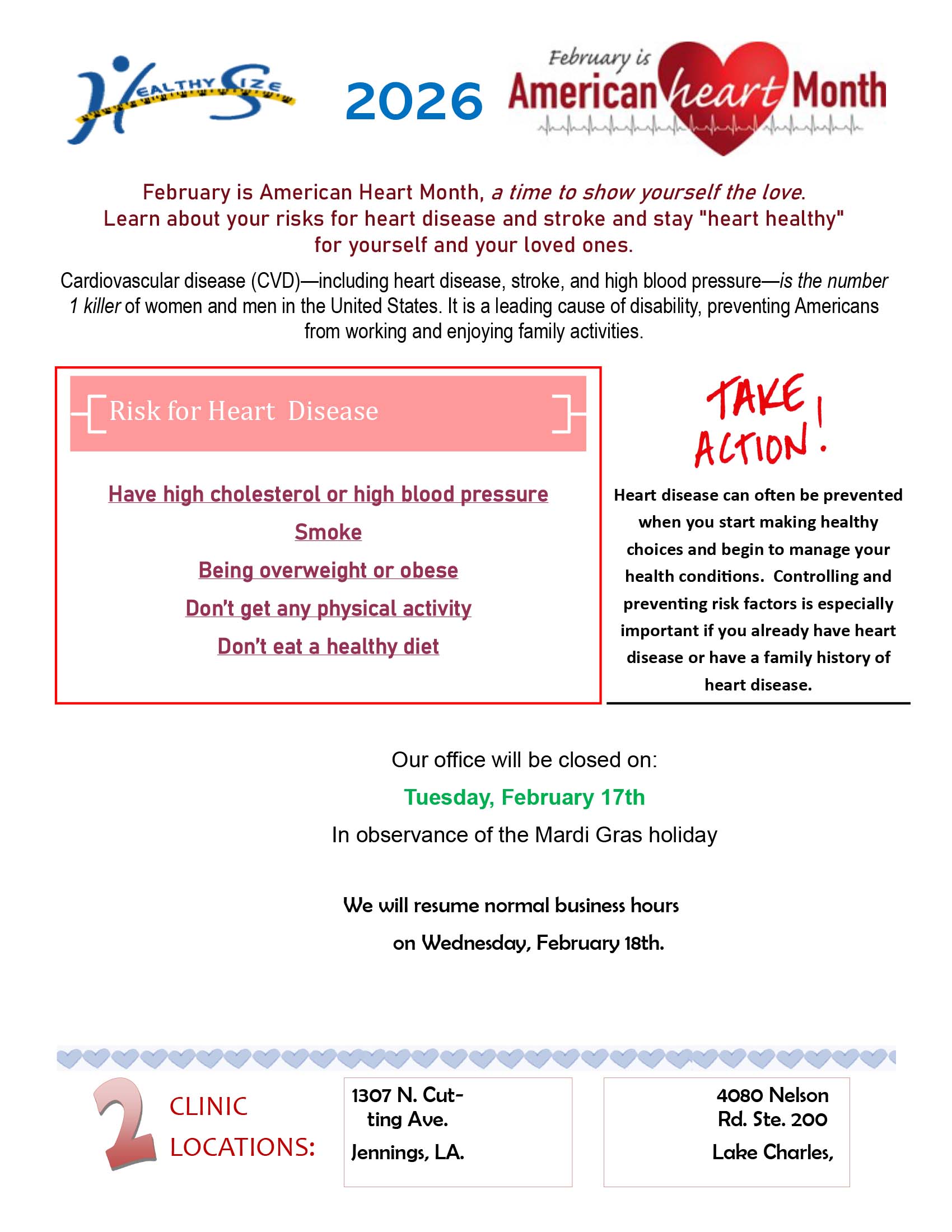 February 2026 Newsletter February 2026 Flyer January 2026 Newsletter January 2026 Flyer December 2025 Newsletter December 2025 Flyer NOVEMBER 2025 Newsletter NOVEMBER 2025 Flyer Address 1307 N Cutting AvenueJennings, LA 70546 Hours Mon & Fri: ClosedTues - Thurs: 8am – 5pm*Closed for lunch 1-2pm 337-824-5200 healthy.size@yahoo.com