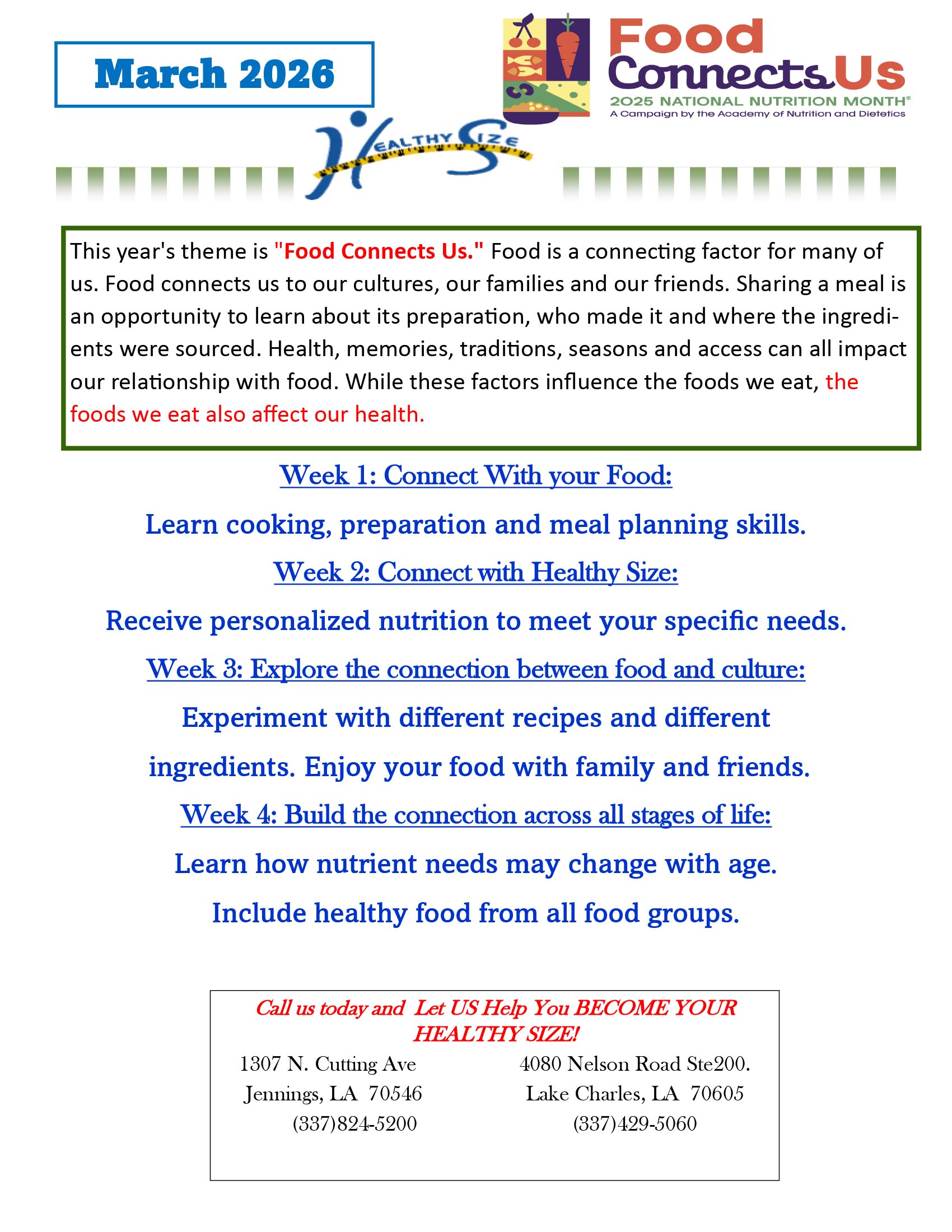 MARCH 2026 Newsletter MARCH 2026 Flyer February 2026 Newsletter February 2026 Flyer January 2026 Newsletter January 2026 Flyer December 2025 Newsletter December 2025 Flyer Address 1307 N Cutting AvenueJennings, LA 70546 Hours Mon & Fri: ClosedTues - Thurs: 8am – 5pm*Closed for lunch 1-2pm 337-824-5200 healthy.size@yahoo.com