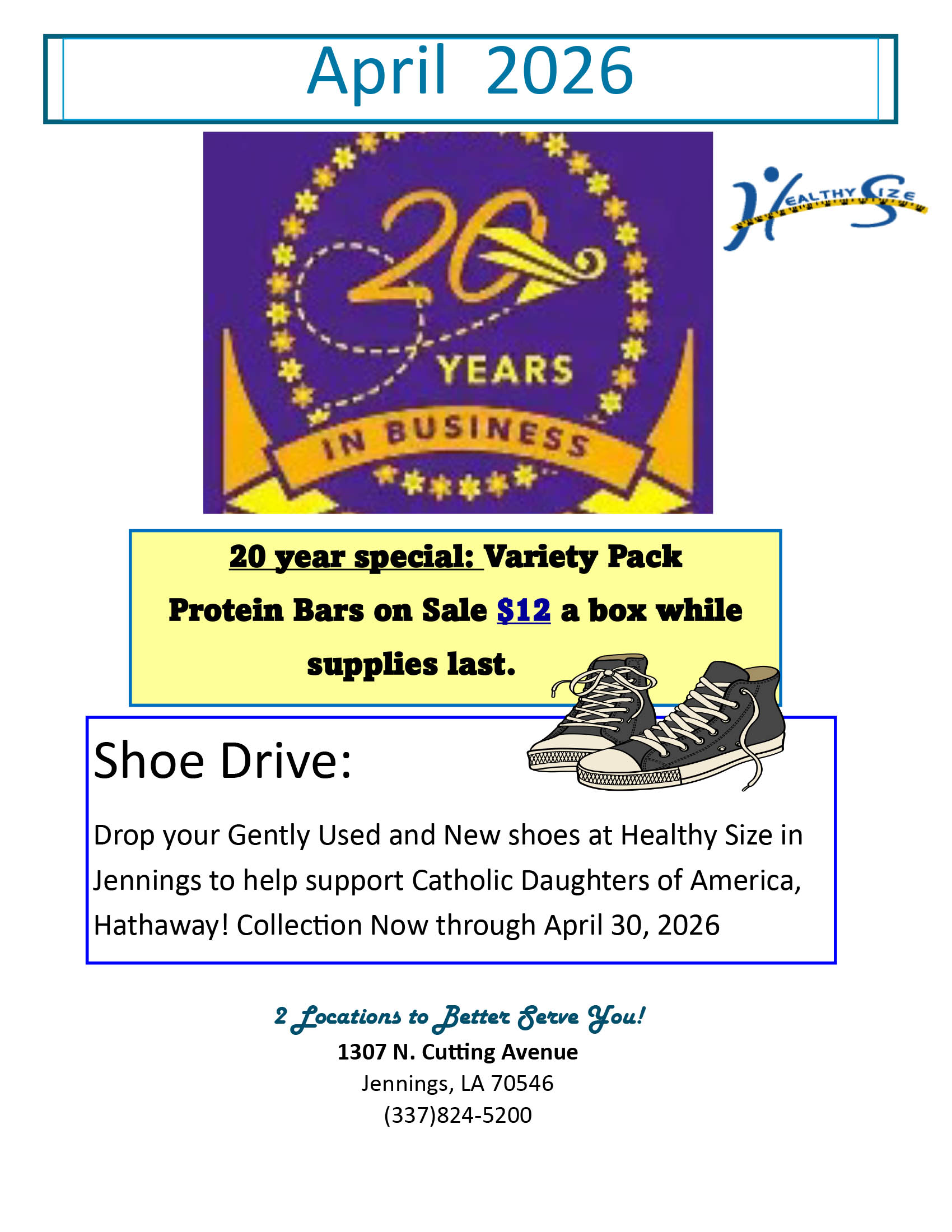 April 2026 Newsletter April 2026 Flyer MARCH 2026 Newsletter MARCH 2026 Flyer February 2026 Newsletter February 2026 Flyer January 2026 Newsletter January 2026 Flyer Address 1307 N Cutting AvenueJennings, LA 70546 Hours Mon & Fri: ClosedTues - Thurs: 8am – 5pm*Closed for lunch 1-2pm 337-824-5200 healthy.size@yahoo.com